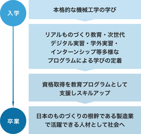 機械工学の基礎の確実な修得と、リアルものづくりを中心とした実習による知識の定着により、日本のものづくりを支えてゆく人材を目指します。