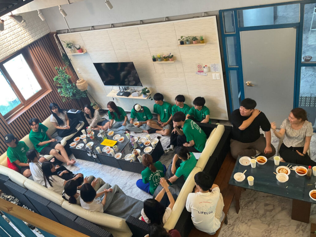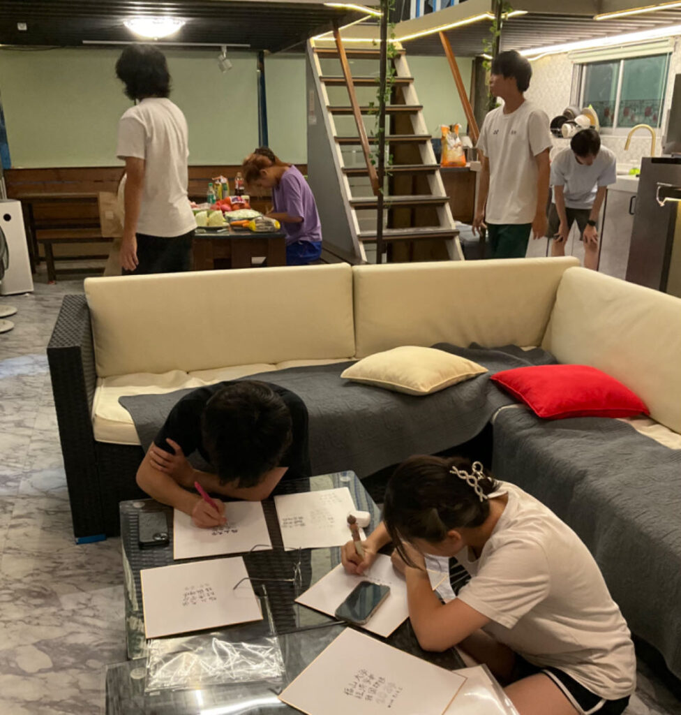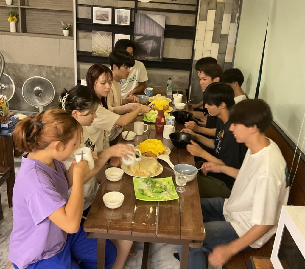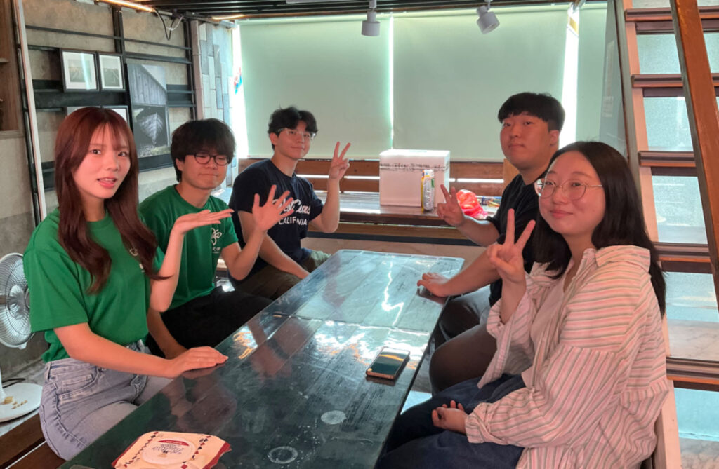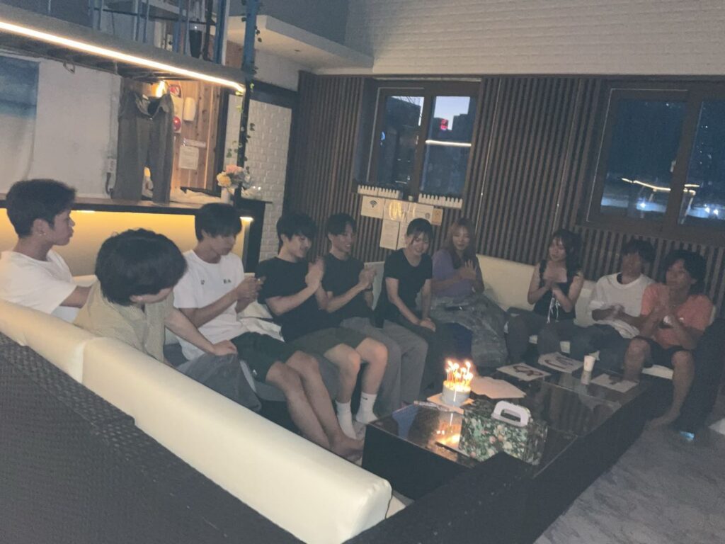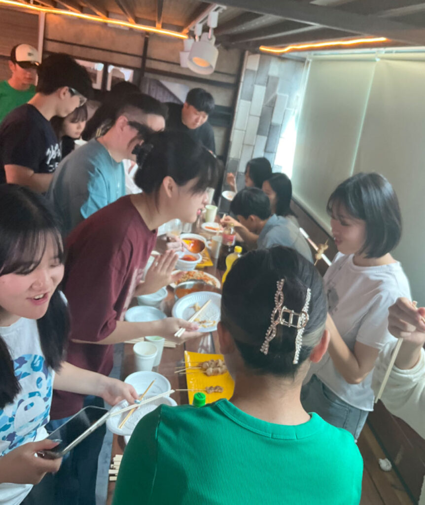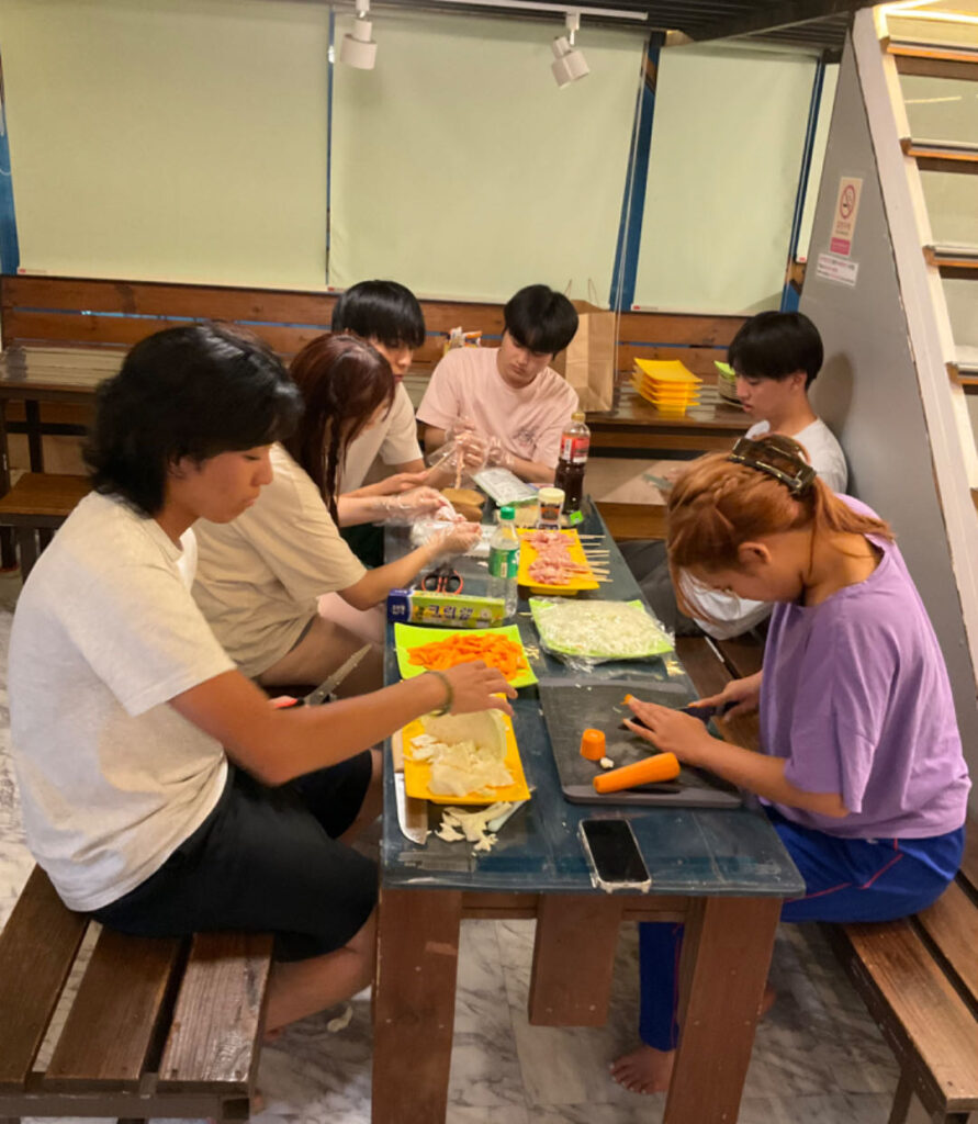 夕食のメニューには、日本と韓国の折衷料理が中心で、毎晩賑やかで喜び合う時間を過ごしました。例えば、ある日には卵を30個も使った超ジャンボオムライスを作り、全員が驚きのあまり大歓声を上げた日もありました。かと思うと、別の日にはお互いの恋話や趣味について語り合いながら心温まるひと時を過ごしました。料理を通じて自然に会話が弾み、参加者間の絆を強め、充実した時間を過ごせました。最終的には、お祝いすべき三人とおいしいケーキをシェアして、いい思い出作りができました。この韓国研修の体験は、参加者全員にとって非常に充実したものとなり、共に過ごした時間が素晴らしい思い出となりました。