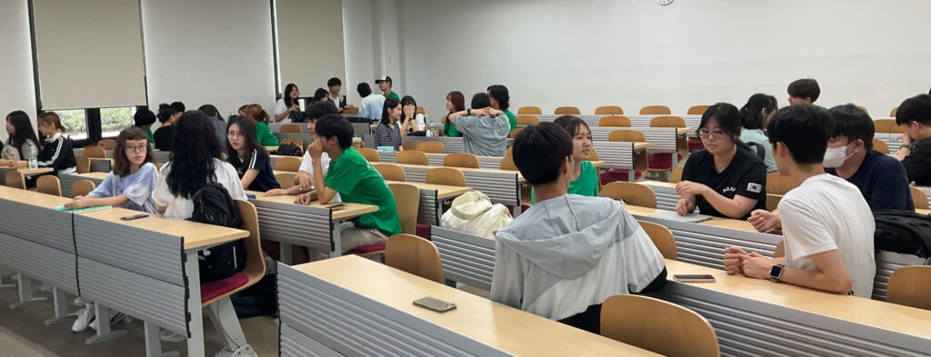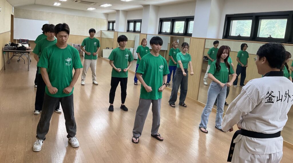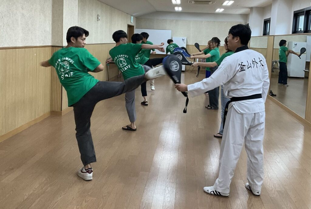 2022年に福山大学と交流の協定を締結している釜山外国語大学では、午前と午後に分けて交流活動を行いました。午前中には日本語融合学部のユン教授の日本語の授業に参加して交流活動をし、午後には社会スポーツ学科のチェ教授のもとで韓国式空手であるテコンドーの体験をしてから、国際交流チームの案内でキャンパスツアーをすることで、充実した楽しい一日を過ごしました。
