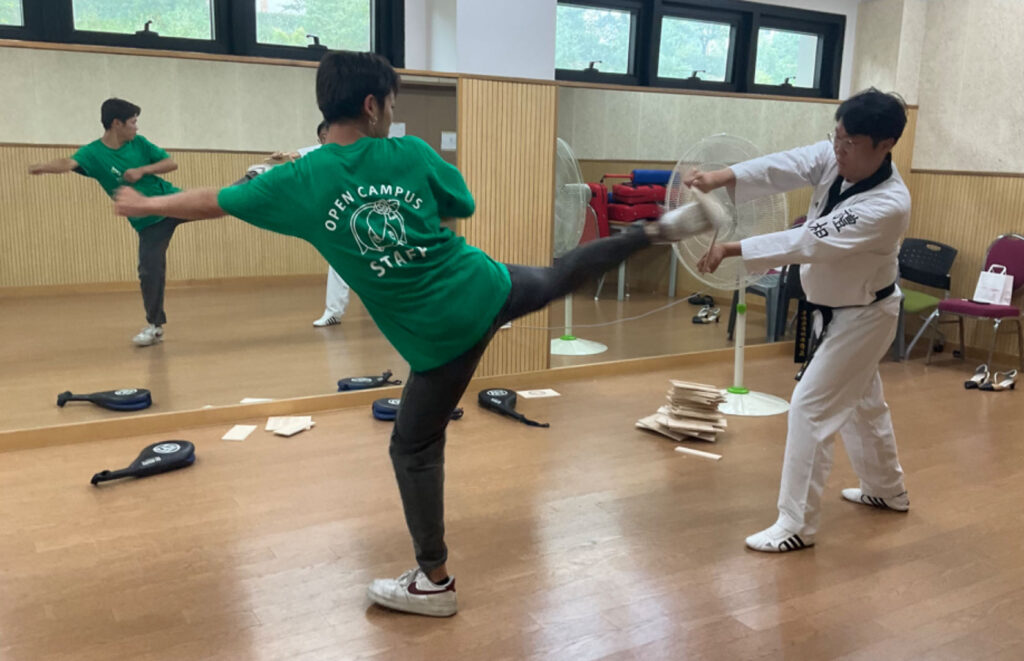 午後には体育館に移動して、チェ教授の指導のもとで約一時間のテコンドー体験をしました。準備動作や基本姿勢、注意事項の説明の後、テコンドーの基本動作であるキックを三種類教えてもらいました。フロントキック、サイドキック、バックキックの3つの基本動作は低い位置から高い位置まで三段階に分けて練習しました。二人一組で、片方がシングルミットをもち、もう片方がキックを行い、交替交替で練習しました。最終段階では、ミットに代わって二枚の木の板を蹴れるレベルにまで上達しました。安全についての説明をしっかりしていただいたお蔭で、誰一人怪我もなく練習ができて、みんな非常に達成感を感じていました。