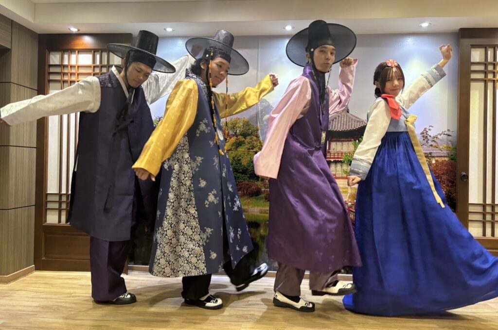 韓国の服飾文化に浸ってみるため、釜山市立博物館を訪れ、着付け体験をしました。韓国の伝統衣装として知られているハンボク(韓服)は、長い歴史の中で変化してきましたが、現在のようにチョゴリが長い形のハンボクを着用しはじめたのは、16世紀後半ぐらいからだそうです。宮中服と一般服が用意されてありましたが、私たちは一般服を選びました。一般服と言っても身分によって、「カッ」と呼ばれる黒色の傘の帽子が男性の外出用に使われており、その飾りで身分の等級を示していました。大きな宝石を付けた人ほど身分が上とのことです。また、裕福な家庭のボンボンの衣装も見分けがつくほど異なっていました。このように参加者達は韓国の伝統衣装の着付けを通じて、その歴史や社会階層を学ぶことができました。このブログをご覧の皆様は、次の写真で誰の身分が上なのかを当ててみてください。ハンボクに着替えた途端、みんながトキメキ韓国ドラマ「成均館スキャンダル」の主人公のように見えました。自分一人ではなかなか体験できない韓国の伝統衣装の体験を、皆と一緒に楽しくできたことに、参加者一同は大満足でした。