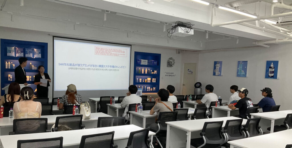 研修参加生の多くが韓国コスメに興味をもっていたため、その要望に応じて、一社目の企業見学はDr. SANTE化粧品会社に見学の依頼をしました。Dr. SANTEは釜山の中心地、釜山駅近くに位置し、周辺にはEXPO会場などもありました。21年の歴史を有していて、昨年度には釜山の優秀企業として第一位に選ばれ、設立当初に比べて現在は売上を30倍以上に伸ばしている成長企業です。