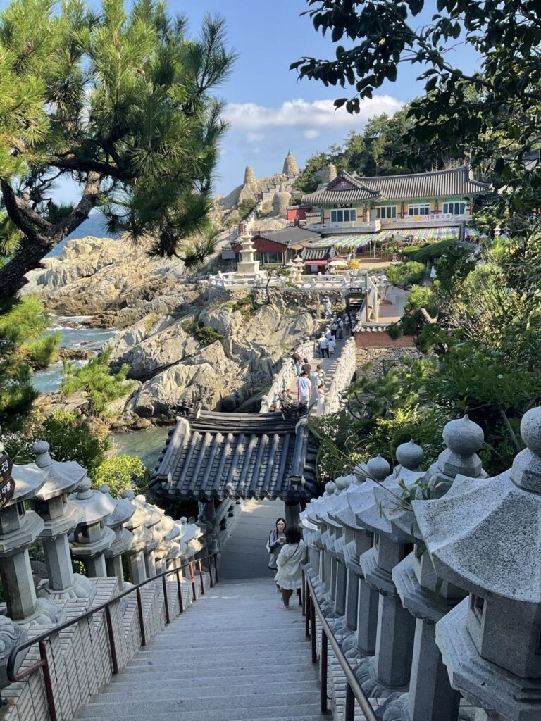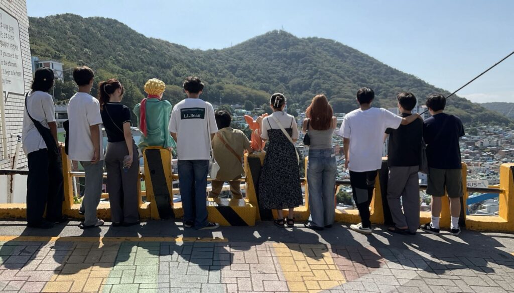 釜山の魅力を感じるため、二か所の観光地を巡りました。一つは珍しく海に建てられた東海龍宮寺で、もう一つは高い丘の上に軒を並んでいる甘川文化村です。前者は、韓国で非常に有名な仏教寺院で、重要な宗教的・文化的スポットとなっていますが、BBCで紹介されたこともあったことから、欧米の観光客が多く訪れていました。海と寺院の絶景が魅力で、海岸線に沿って建てられ、仏教文化と自然、言い換えると仏教建築と美しい海の景色を一緒に楽しむことができました。後者は、1960年代から70年代にかけて急速に形成された貧困地区が、戦後の復興とともに開発を行い、2000年代に入ってから文化的な再生と観光開発が進められて現在は観光地として人気を集めていました。鮮やかな色彩とユニークなデザインで装飾されている家々、カラフルなストリートアートや壁画は地域の文化や歴史を反映していました。村のシンボルとなる星の王子様の展望台では市内を一望でき、記念撮影スポットとして撮影のために列ができるほどの大人気場所でした。今回の観光を通じて、参加者は韓国の宗教的な価値観や歴史に触れることができ、アートが地域社会に与える影響などに関して学ぶことができ、異文化理解を深める機会となりました。