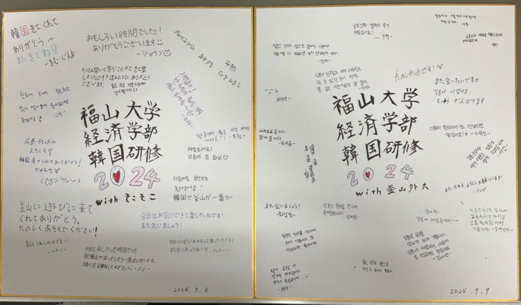 今回の交流が福山大学の学生には、自己認識を深める機会になっただけでなく、積極的な社会参加の意識やグローバル意識の刺激となり、学問的知識を超えた多面的成長の必要性を感じさせるいい契機となりました。今回の交流活動の窓口となってくださった釜山外国語大学の国際交流チームをはじめ、楽しい交流活動ができるように支えて下さった各先生方には重ねて感謝致します。