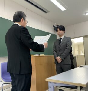 まずは、学科総代の村上映人さんに、賞状とメダルを授与しました。
