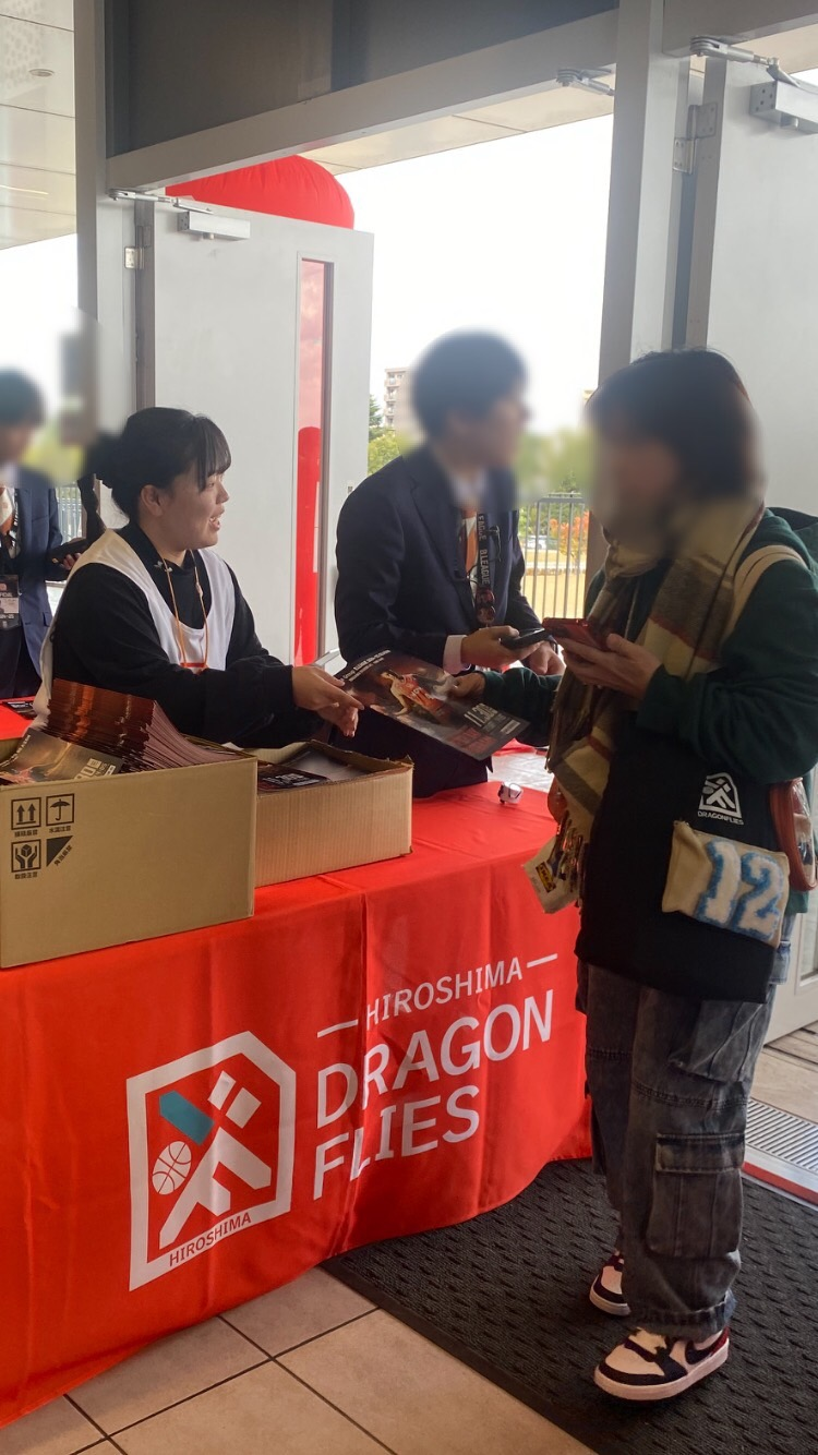 3年生の6月には、広島ドラゴンフライズ主催試合で、2年生の後輩5名とともに、スタッフとして入場受付や管内案内などサポートしました。来場者が想像以上に多く驚きましたが、経営・試合運営の工夫などを現場で学ぶことができて勉強になりました。