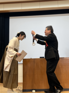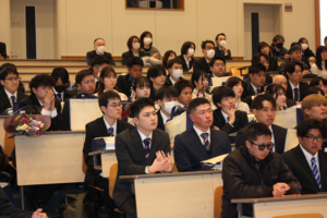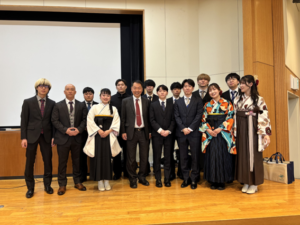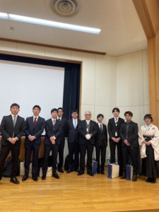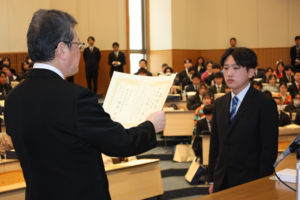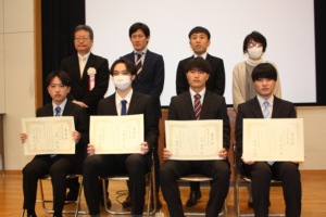 最も優れた卒業論文を作成した卒業生4名に、楠田学部長から学部長賞の賞状と記念品が授与されました。がんばりが評価されてよかったですね。3年生のみなさんはぜひ来年度の受賞を目指して、卒業論文執筆に励みましょう。