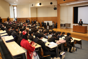 楠田学部長から卒業にあたって訓話がありました。イギリスの名言「一日幸せでいたいならば、床屋に行け。一週間幸せでいたいなら、車を買え。一ヶ月幸せでいたいなら、結婚をしろ。一年幸せでいたいなら、家を買え。一生幸せでいたいなら、正直でいることだ。」がはなむけの言葉として贈られました。