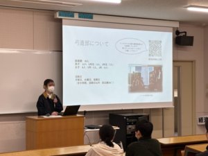 2年生の三姓実空さん(広島県立大門高等学校出身)と山本千華さん(広島県・並木学院福山高等学校出身)は今回が初めての発表でした。三姓さんは弓道部入部のいきさつや活動内容について紹介しました。