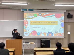 スポーツマネジメントコース3年生の亀山愛莉さん(広島県立御調高等学校出身)は、いろいろな地域のイベントにも携わり、9月の見学会でも学生ボランティアとして参加するなど、活動的な学生です。コースを選択した理由やどんなことを学んでいるのかを中心に説明しました。