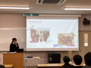 卒業を5日後に控えた4年生3名も参加し、自身の4年間の活動を振り返り、学びや成長した点などを説明しました。井上乃ノ袈さん(広島県立神辺旭高等学校出身)は、1年次より学友会執行部に所属し、三蔵祭やキャンパスイルミネーション、学友会ツアーなどさまざまな活動に携わってきました。