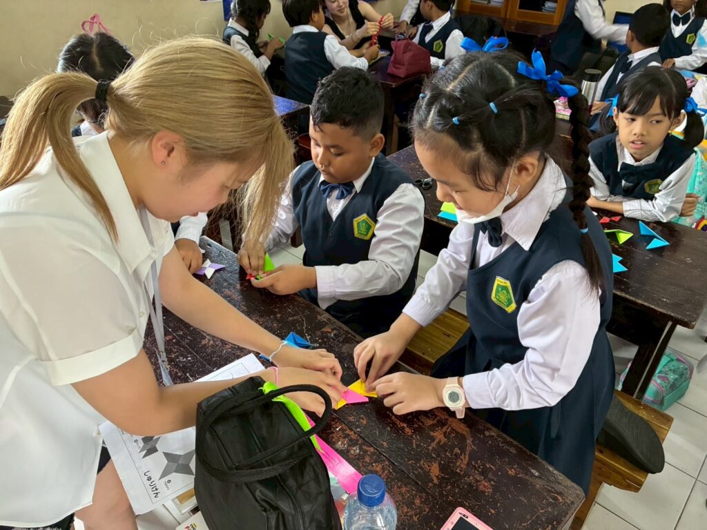 午後には、さっそく小学校の教室を訪問しました。5つの教室に分かれて、折り紙を一緒に折ったり、日本文化を説明したりしました。どの児童も元気一杯で、そのエネルギーに始終圧倒され大学生メンバーはへとへとになりながら交流を終えましたが、子ども達の笑顔が印象的でした。中には、サイン責めに合う学生も。