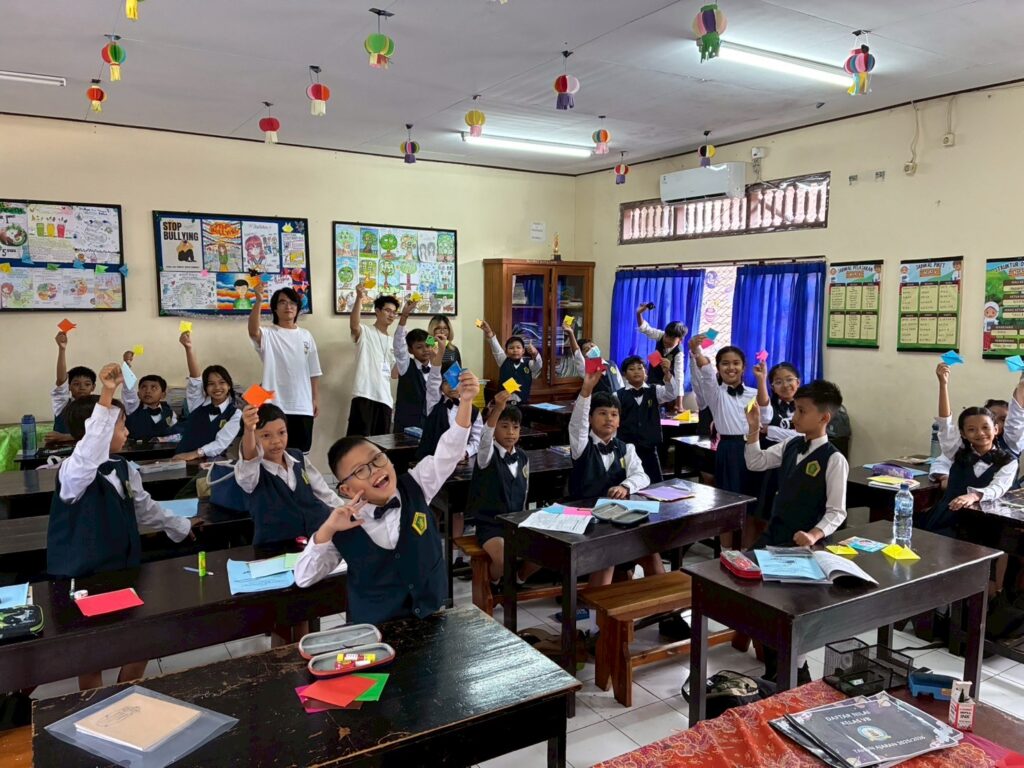 英語の授業は、普段の生活の中ですぐ使える内容だったのが印象的でした。体も動かしながら様々なフレーズを学んでいました。この日は木曜日で、バリ島の学生は伝統衣装を着て登校します。私たちも、伝統衣装を借りて授業に臨みました。