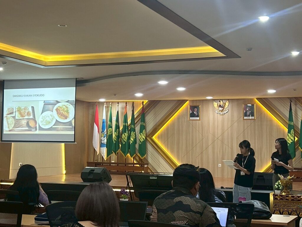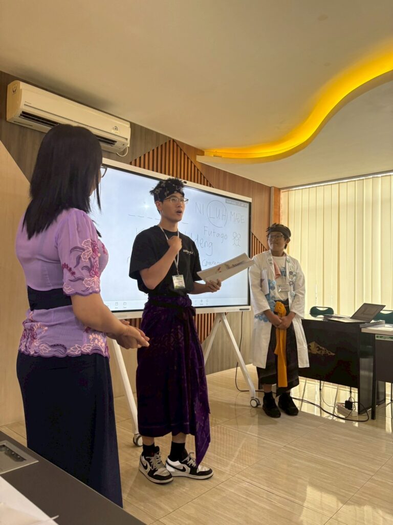 最終日は国際交流会として、日本からバリ島研修にやって来ていた他大学や受入れ校であるマハサラスワティ大学の学生がお互いに発表を行いました。福山大学からの学生は、英語で大学紹介を行いました。大人数の前で、英語で発表するのは緊張しますが、練習の成果を発揮することができました。