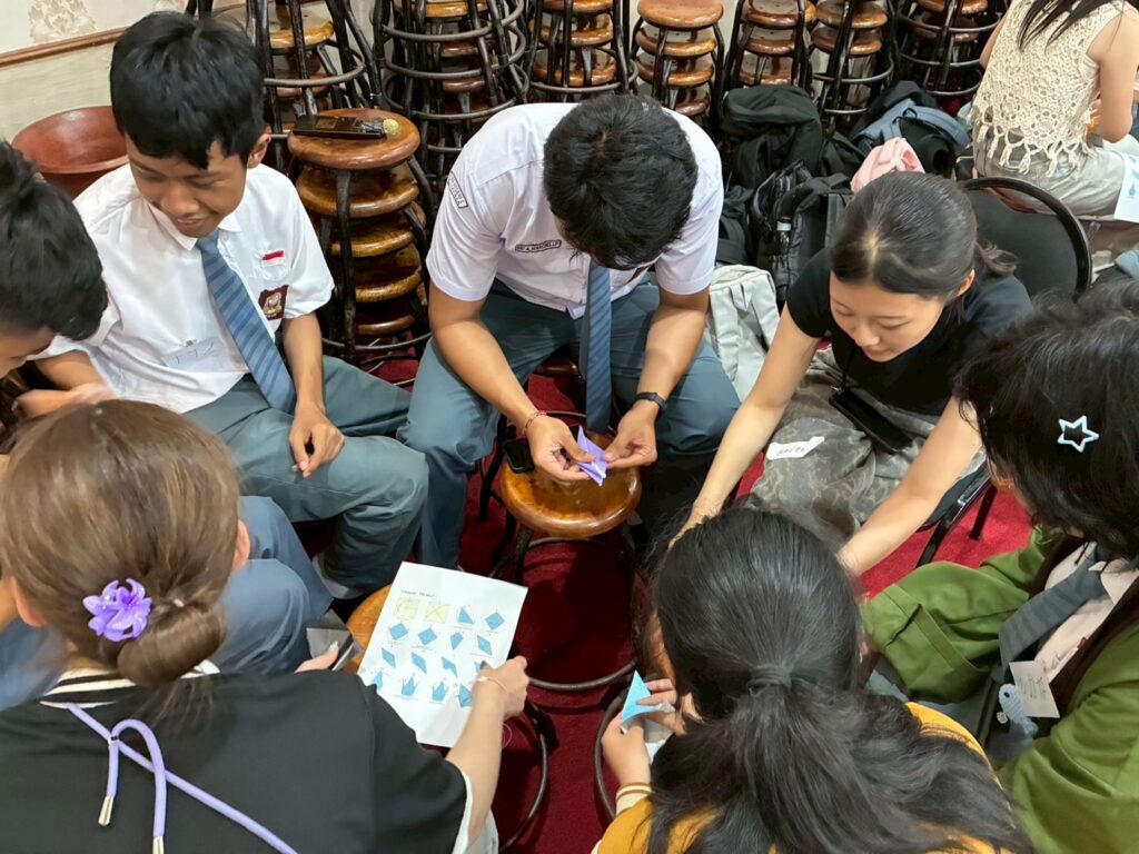 他の日には、高校へも訪問しました。日本語を勉強しているクラブ活動の生徒さん達とともに、お互いに質問をしあったり、折り鶴を一緒に折ったりしました。中には、日本の大学へ進学を希望している学生もいて、福山大学への進学に関する質問も受けました。