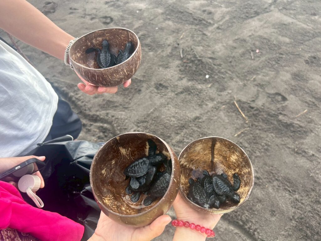ウミガメの放流活動にも参加しました。ウミガメは世界に7種類いますが、このバリ島には3種類のウミガメが上陸します。地元の活動団体では、ウミガメが砂浜に産卵した卵を保護し、孵化させて、数日ほど飼育したあと海へ放流しています。大きく育つ個体は1%にも満たないそうですが、地道な活動を通してウミガメを増やす活動を行っています。