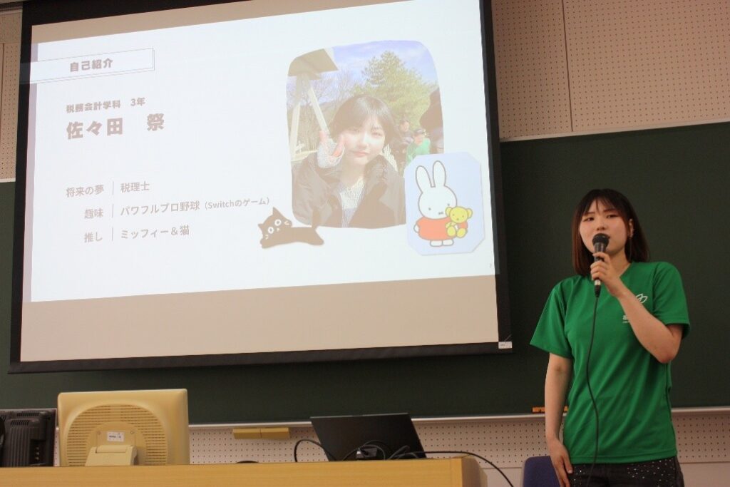 特に、1年次は大学生活に慣れながら一般教養科目や経済・会計の基礎知識を学ぶこと、2年次は専門科目が増えて学びが深まると同時にアルバイトやサークル活動など学外活動にも取り組む余裕が生まれること、そして3年次は会計・税務などの専門科目に集中でき、これまでの学びが力として実感できるようになることなどを、私自身の体験を交えながら具体的に紹介しました。また、資格試験の勉強と大学生活の両立についても、日々のスケジュールや学習の工夫をお伝えしました。