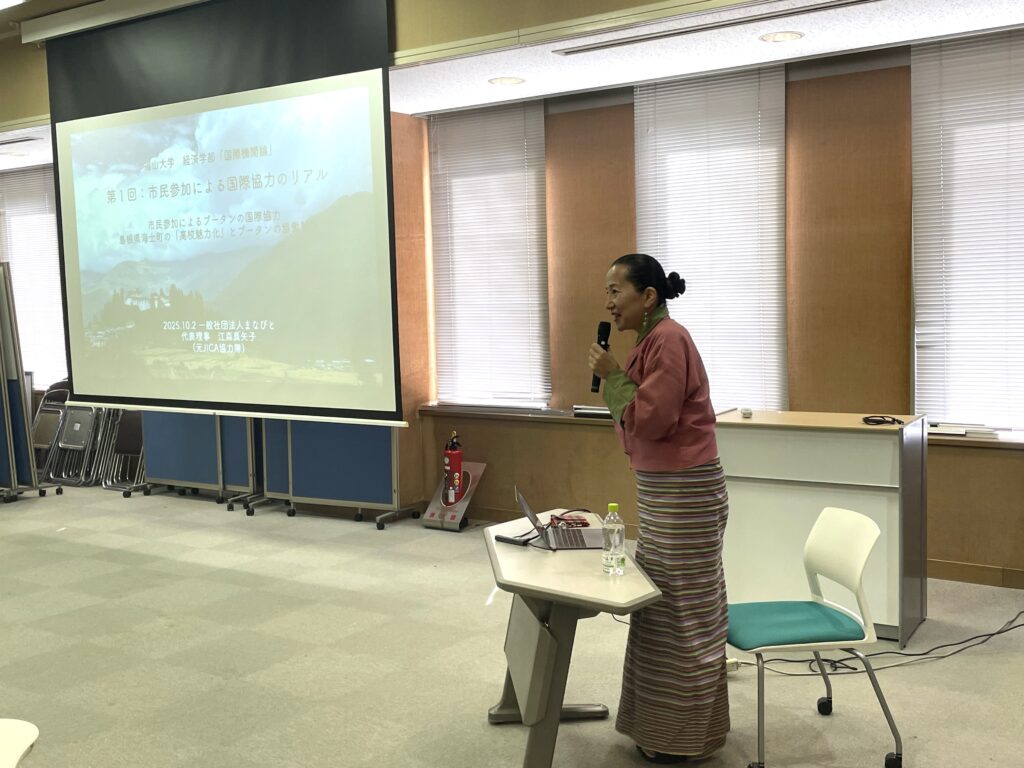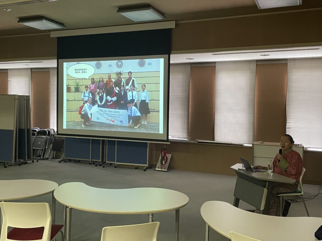 10月2日(木)の第2回講義では、一般社団法人まなびとの江森真矢子氏に対面で登壇いただきました。江森氏は、JICA草の根技術協力事業として、日本の「辺境」の離島・島根県海士町(あまちょう)の「高校魅力化プロジェクト」の知見をブータンに展開する「PBL for GNH(地域課題解決学習)」に携わっています。