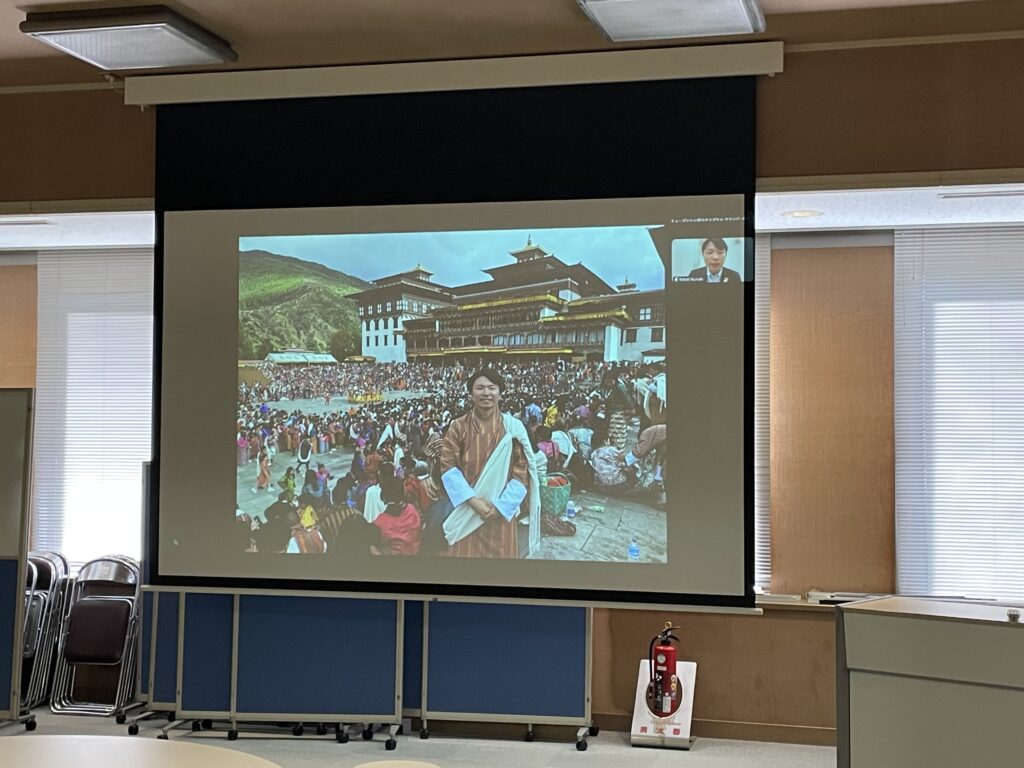 10月9日(木)の第3回講義は、JICAブータン事務所から塗木陽平氏がオンラインで、京都大学大学院の石内良季氏が対面で登壇するという、マクロとミクロの両視点からブータンを深く知るセッションとなりました 。