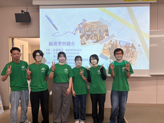 オープンキャンパスで金融経済コースでの学びについて説明する永留さん(右奥)