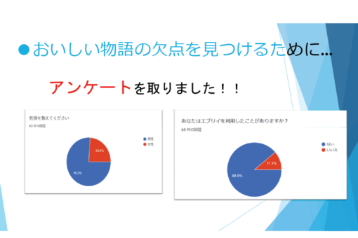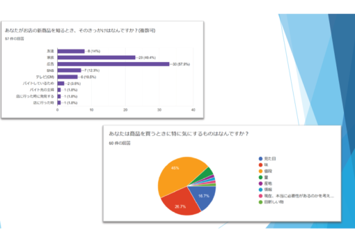 「地域調査の授業は、エブリイさんと合同でプレゼンテーションを行いました。今回は、リモートでしたが、問題なくすることができました。そして、今回の授業で、アンケート作成について学びました。アンケート作成は今回が初めてで多くのことを考えなければならないと感じました。「ターゲットは誰なのか」「アンケートはどこでどうやってとるのか」「どうしたら多くの回答をもらえるのか」など多く考えました。日々何気なく回答していたアンケートにも、いろいろな考えや思いがあるのだなと、アンケート作成の経験を通して学びました。また、こういった企業と連携した授業で社会経験をしておくのは大切だと感じました。実際の企業の雰囲気や会議の様子、プレゼンの仕方など将来に役立つ情報を知ることができるからです。この経験を生かして、またどんどんいろいろなことに挑戦したいと思いました。」