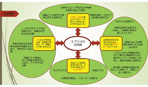 前期連携授業では、「地元企業の魅力を知り、伝える」をテーマに、エブリイ社オリジナル商品の「おいしい物語」ブランドの新商品開発提案、エブリィの経営手法研究など5つの課題に対して、5つのチームに分かれてディスカッションをしていただきました。