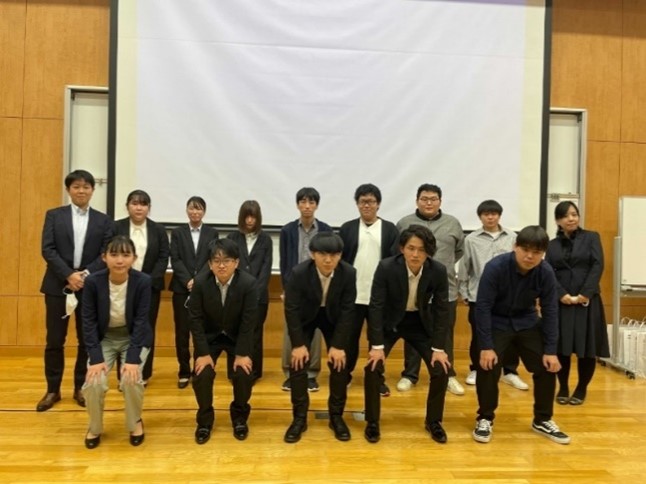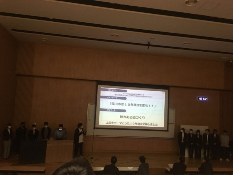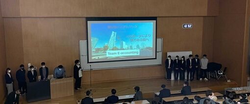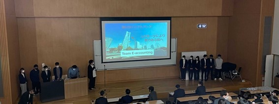 本講義の集大成である最終発表会、つまり、プレゼンテーション大会が福山市立大学で行われました。当日はゼミ生一同大変緊張していましたが、リーダーである新川哲司くん、サブリーダーである林裕基くんを中心として、チーム「E-accounting」らしい発表をすることができたと思います。