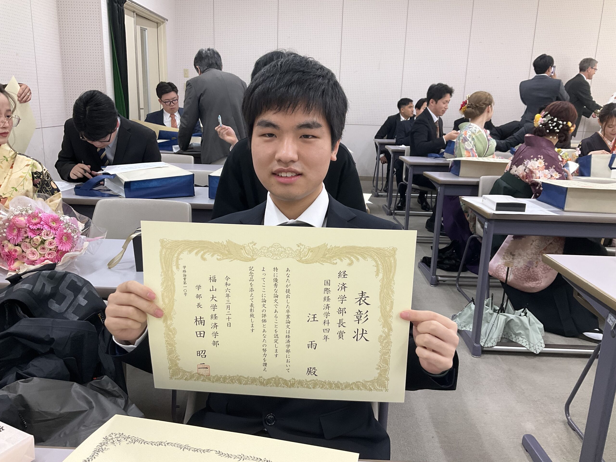 3月20日(水)に2023年度学位記授与式が行われました。今回は、2023年度「経済学部長賞対象卒業論文執筆者」の汪雨君の感想をお学長室ブログメンバーの白がお伝えします。