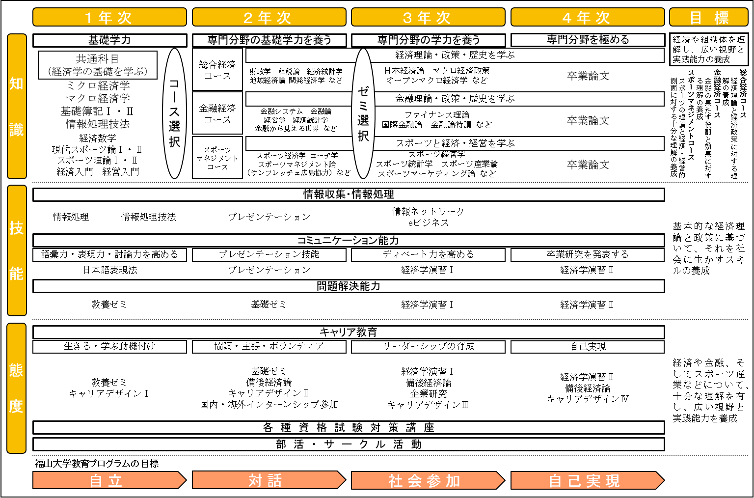 総合経済専門科目である「財政学」,「租税論」等により専門分野の基礎学力を養い,国際経済専門科目である「地域経済論」,「開発経済学」等により教養を広げながら,経済学の理解とその応用を実践できる人材としての自覚を持つ。