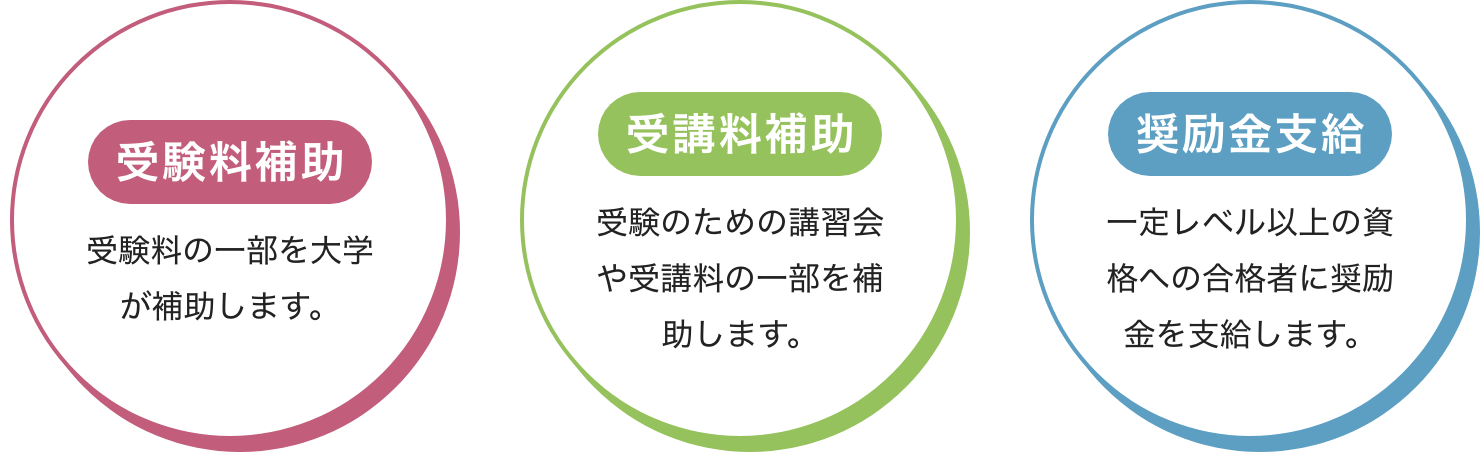 [受験料補助]受験料の一部を大学が補助します。 [受講料補助]受験のための講習会や受講料の一部を補助します。 [奨励金支給]一定レベル以上の資格への合格者に奨励金を支給します。
