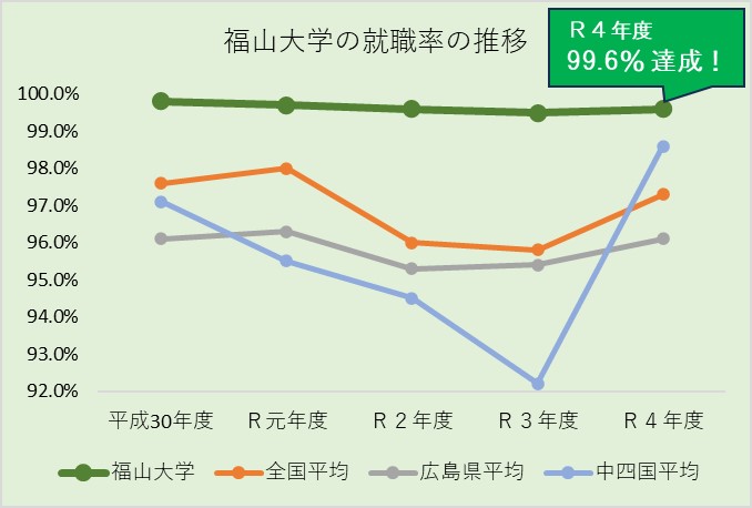 福山大学では、毎年、全国平均よりもかなり高い就職率を達成しています。