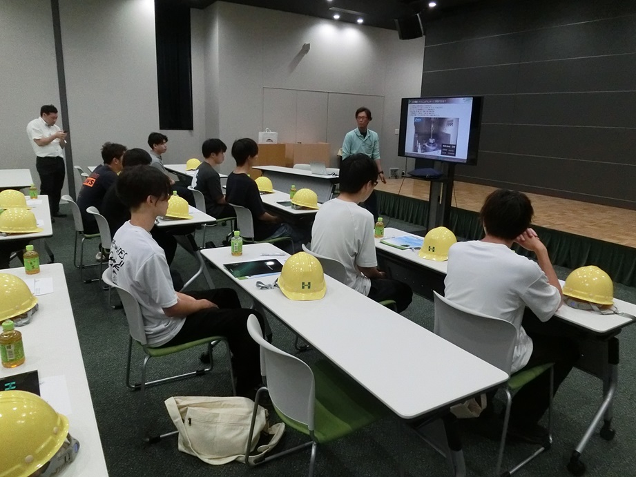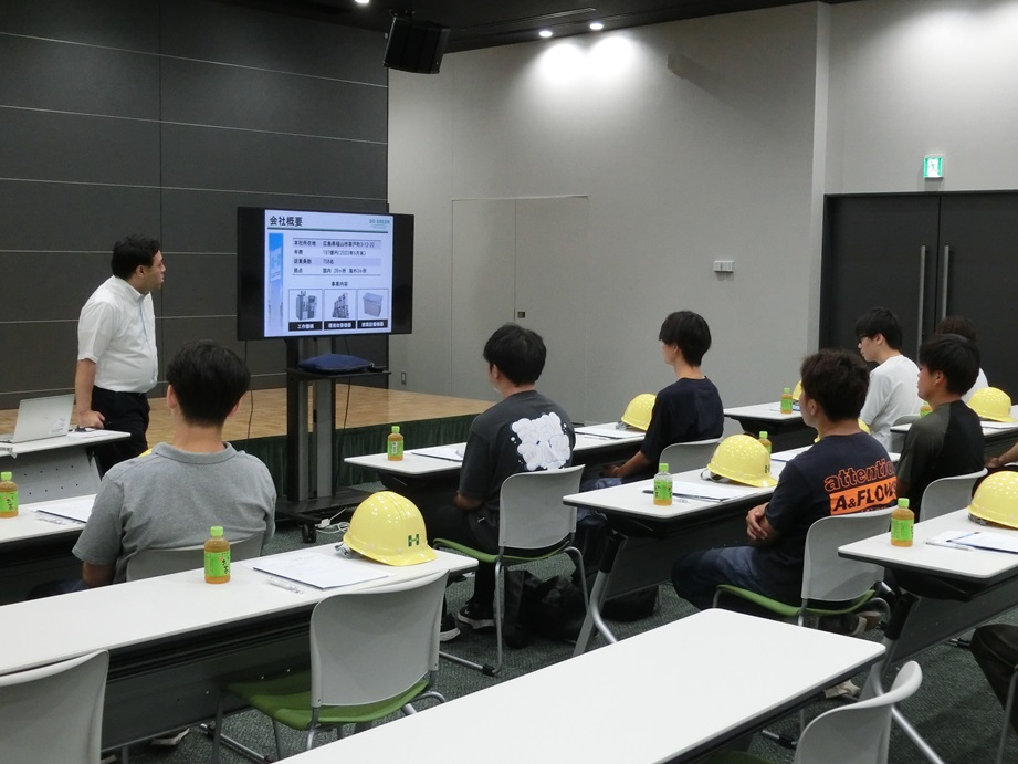 工場の見学後には福山大学機械システム工学科卒業生の方にホーコス株式会社が取り組まれている新しい内容の説明や仕事への取り組み方などについて話をしていただきました。