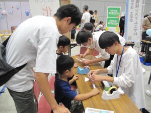 今回は、大学生と高校生が一緒になって機械システム工学科のブースを運営しました。高校生は大学生にいろいろ相談しながら無事に終えることができました。また、高校生と一緒にイベントを実施できればと思います。