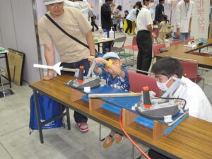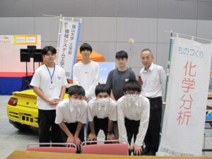 福山工業高校工業化学科の生徒3人は、機械システム工学科の学生の指導を受けながら工作教室を実施しました。