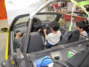 レーシングシミュレータも大人気で小さな子供はハンドルにしがみつきながら運転していました。