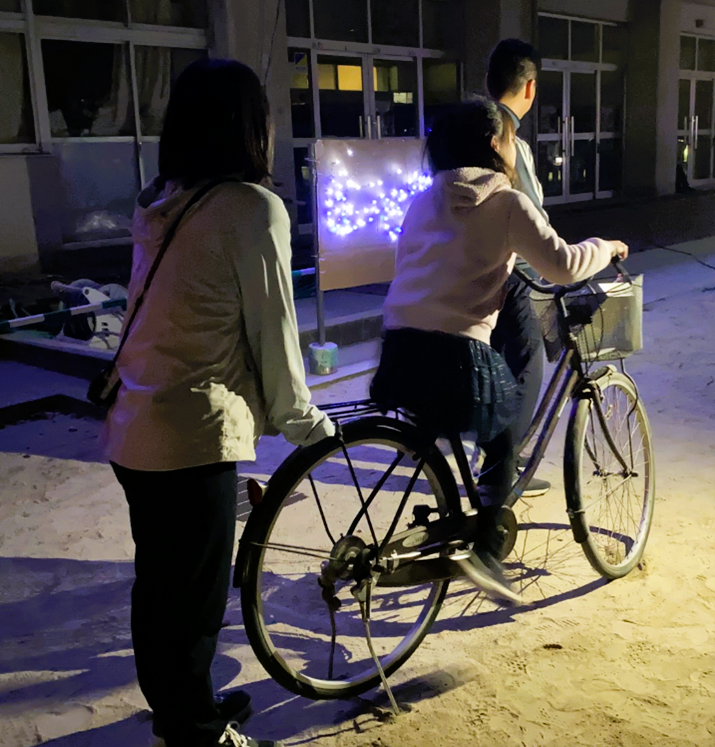 しかし、限られた予算の中で劣化の進んでいくイルミネーションを保守しながら続けていくことは大変難しいことです。LED切れや断線を丁寧につなぎなおしながら、続けてこられたのは児童と先生方の情熱でした。第一回から連綿と受け継がれてきた“みつばのクローバー”は児童たちが暮らす3つの町のつながりを象徴するシンボルです。また、自転車による発電によるライトアップは自分たちの力で町を照らす役に立ちたいという感謝と報恩の心から、このイベントになくてはならないものとして続けられています。