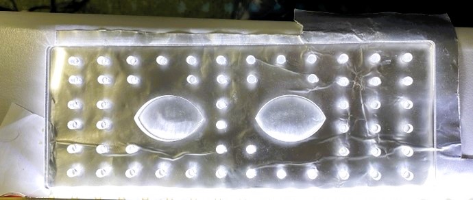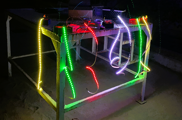 本年度は小学校の要望に応えて2つの新しいイルミネーションを提案しました。一つは「つながりのテープライト」(左写真)であり、リモコンで色や発光パターンを連携して操作できるものです。もう一つは「光るめがね」(右写真)でアクリル板に開けられた穴が輝くという怪しげな(?)オブジェクトです。今年は最初のお披露目でしたが、今後のイルミネーションでの活躍が期待されます。