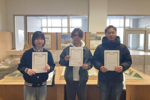 今回宅建士に合格したのは、建築学科4年生の森田菜南さん、3年生の前田尊生さん、三輪幹太さんです。