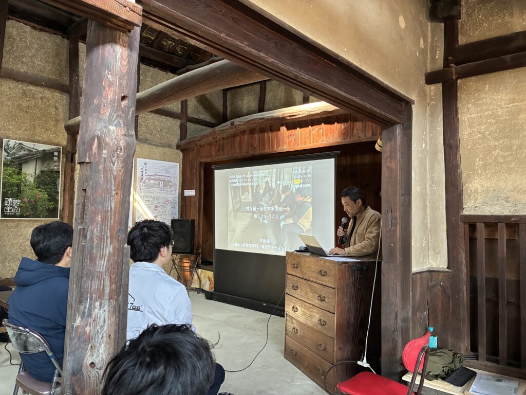 続いて、建築学科 佐藤圭一教授から「神な備-旧松本家住宅-を開くということ」というタイトルで、「神な備」のこれまでの経緯について説明がありました。