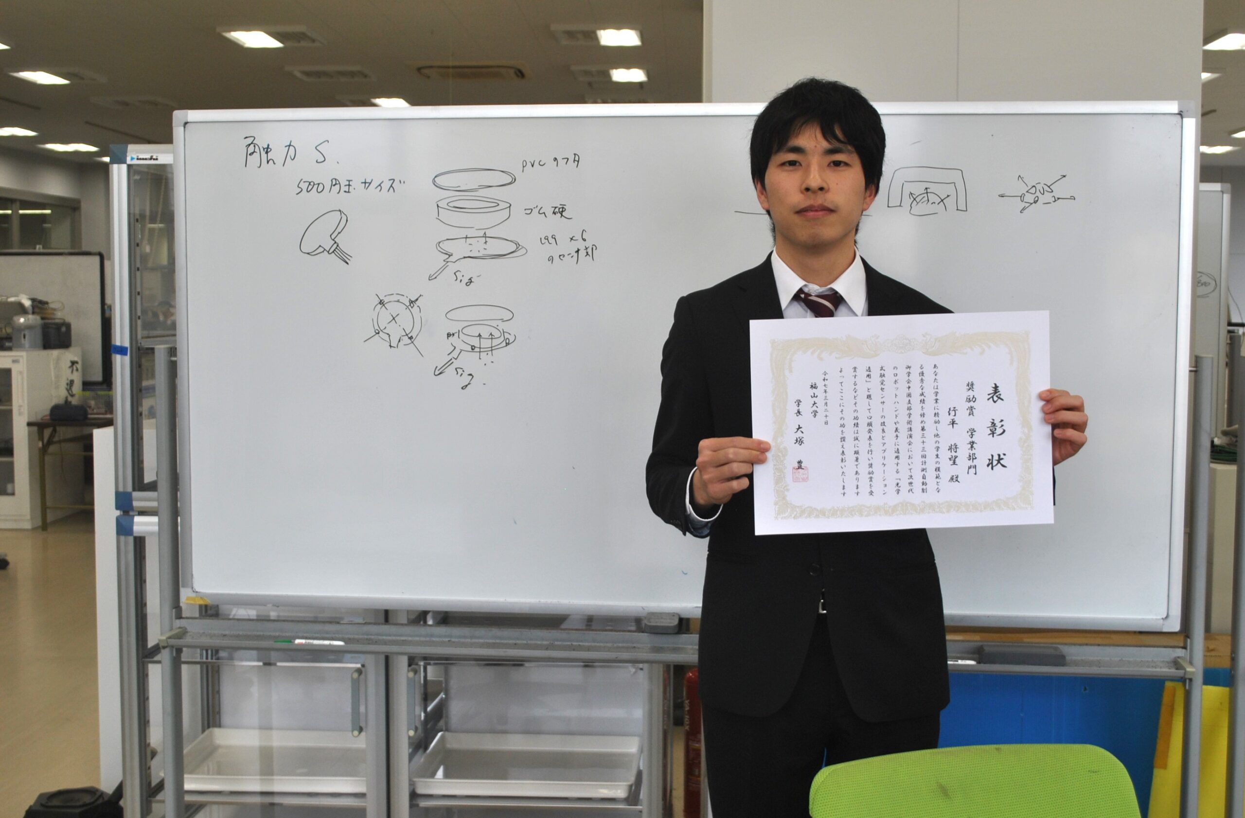 学長から一言:今年度、工学研究科修士課程修了の行平将望さん、自身のものづくりの興味・関心のままに、光学式触覚センサー分野の研究を積み上げて来ました。その結果、学会や本学から表彰されるという成果を上げて、いよいよ社会に羽ばたきます。業界でも注目されている分野とのことですから、世の中を賑わすような優れた技術開発を成し遂げるかも知れません。朗報を待っています。