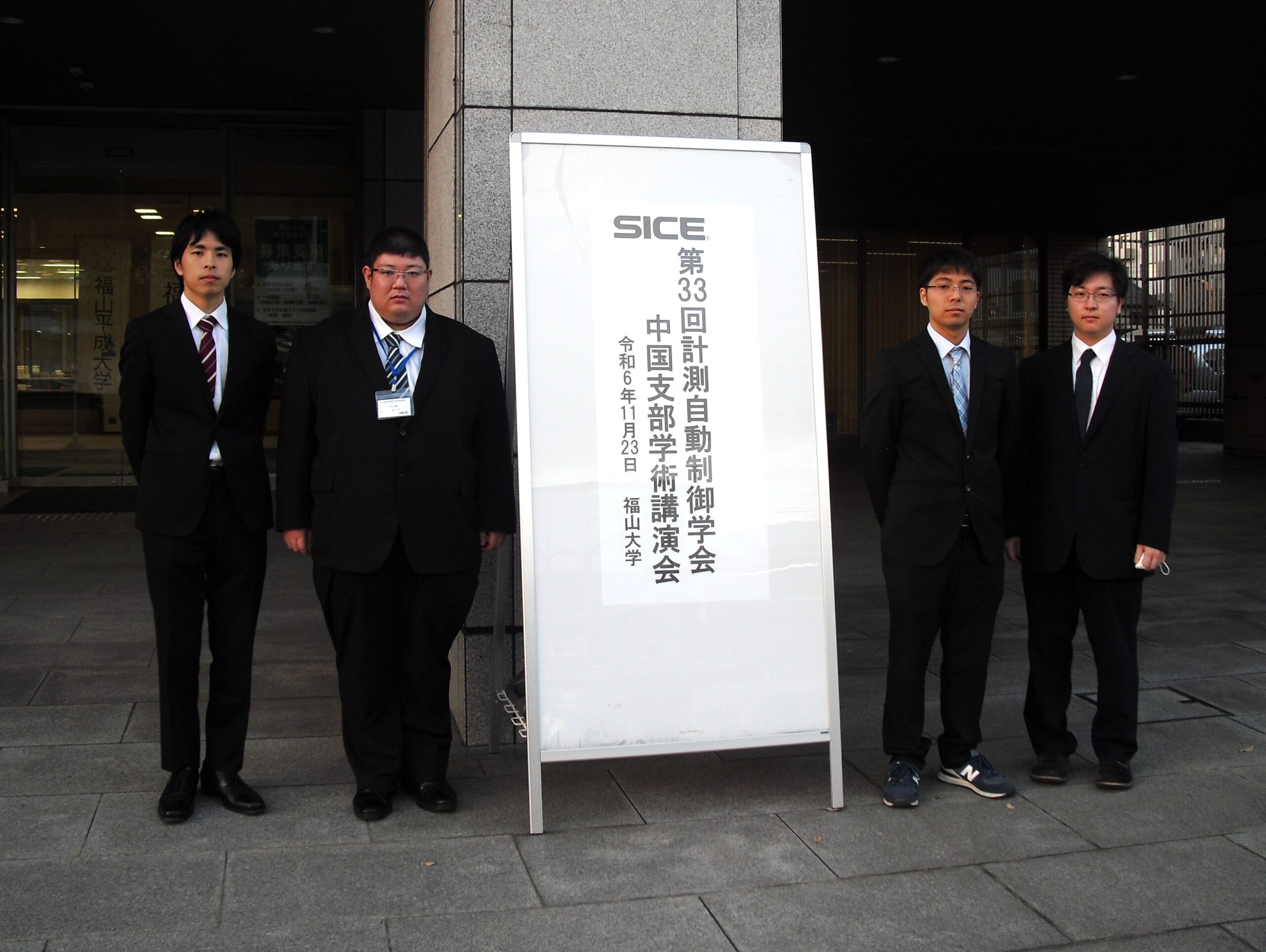 工学部電気電子工学科では、計測自動制御学会(SICE)中国支部の学会活動に積極的に参加し、毎年秋季に開催される学術講演会での研究発表を行っています(2023年/2022年/2021年)。2024年度の第33回学術講演会は10年ぶりに福山大学が幹事校となり、11月23日にJR福山駅北口の福山大学社会連携推進センターでハイブリッド方式開催され、中国地方5県から多くの研究者、学生の方が参加しました。福山大学の学生からは、4年生・大学院生の研究や、1年生のETロボコンでの取り組みなど、次に掲げるような多くの研究発表がありました。