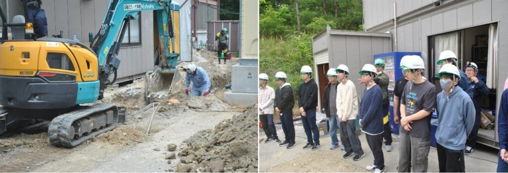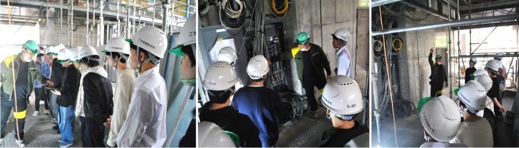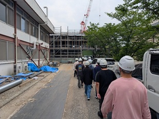 電気電子工学科の沖です。5月29日木曜日午後、電気電子工学科2・3年生で建設中の聚志館(ものづくり工房)を見学させていただきました。電気電子工学科は電気工学コースと電気システムコースがあり、多くの卒業生が電設業界や電気機器メーカーに就職しています。