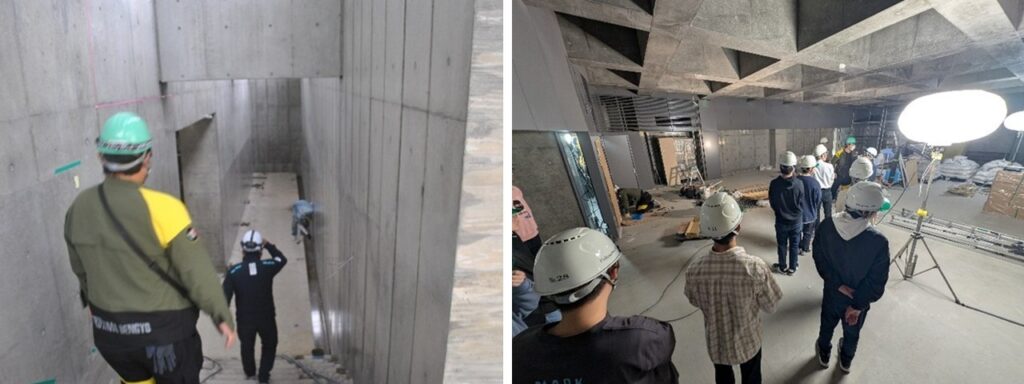 さて聚志館はこの夏に竣工予定で、現在電気設備の工事も行っています。建物内の配線が見られる機会は少なく、ましてや建設中の現場の見学を学内でできるとは、非常に得がたく、ありがたい機会でした。3時間目を使い、学生12名と教員2名で見学させていただきました。