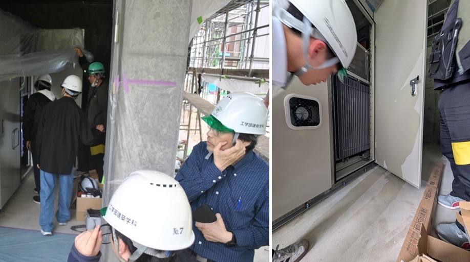次に建物の反対に回り、設置中のキュービクル(高圧受電設備)の説明を受けました。少し狭い場所なので、交代しつつ、内部の装置まで見せて頂けました。非常に大きな装置で組み立て後では建物に入らないので、建物内で組み立てているそうです。