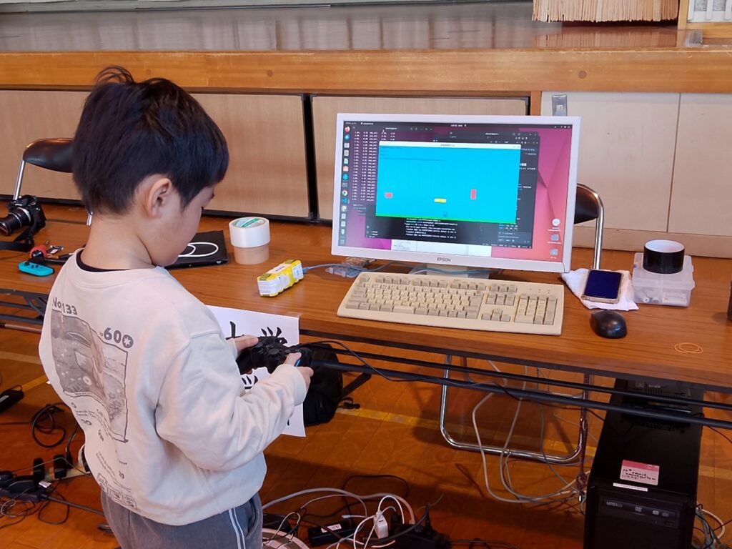今回の出展では、① ロボット掃除機ルンバをベースとした丸形ロボット② LEGOロボットの新作を展示しました。本年度の最大の特徴は、ロボットの制御プログラムをすべてAI(人工知能)によって生成した点です。この技術的な進展について説明すると、来場者からは驚きと大きな関心が寄せられました。そして、いつものように、子ども連れのご家族が切れ目なくコーナーを訪れ、ロボット操縦を楽しんでいただけました。