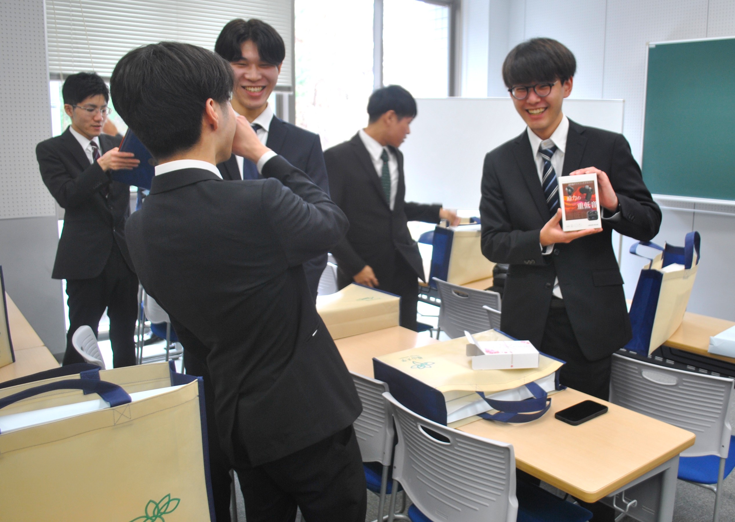 この式の後には、卒業記念の品としてワイヤレスイヤホンが贈られ、思いがけない記念品を受け取ったことで、卒業生のみなさんの間には笑顔が広がりました。