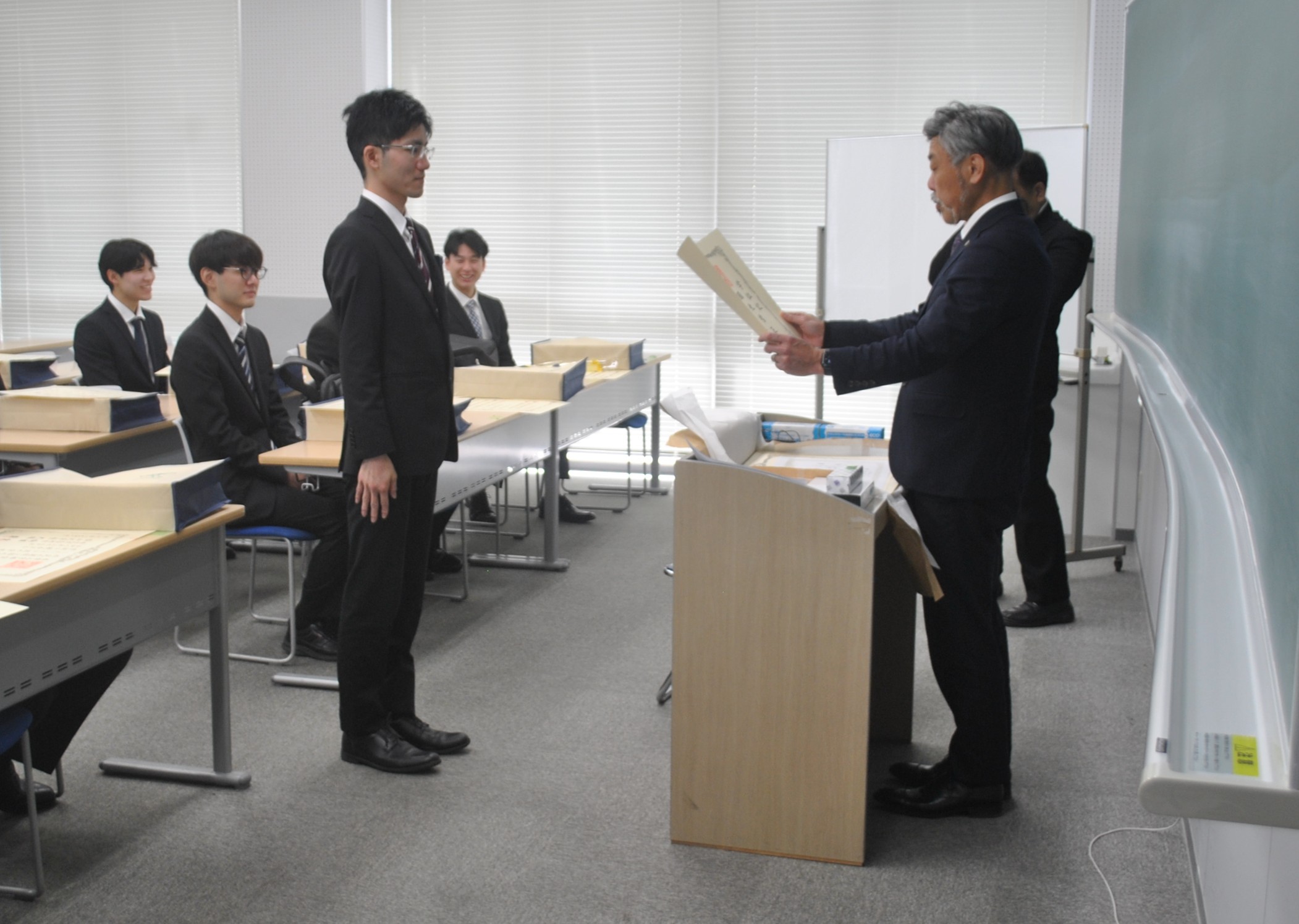 卒業式当日は、卒業・修了するみなさんもスーツ姿で一堂に会し、これまでの福山大学での学生生活を振り返るとともに、新たな門出を迎える節目の一日となりました。1人1人に学位記の授与、学生表彰、そして入学してからの学修レーダーチャートの受け渡しがあり、緊張感、達成感のなかにも和やかな雰囲気の式となりました。