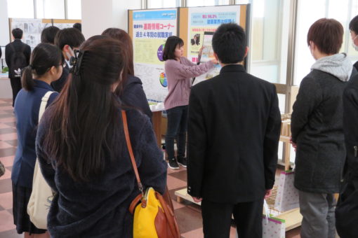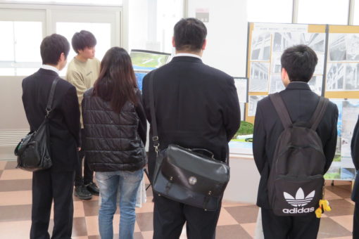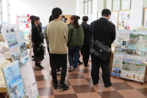 在学生のナビゲートにより、「びんご建築女子活動紹介」や「2018年度就職状況報告」についてのポスター展示、そして、「建築学科学年製図賞入賞作品」をご覧いただきました。
