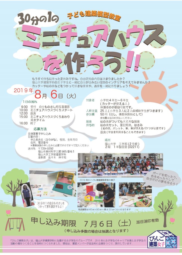建築学科の女子学生グループ「びんご建築女子」による夏休み子ども建築模型教室が開催されます.
