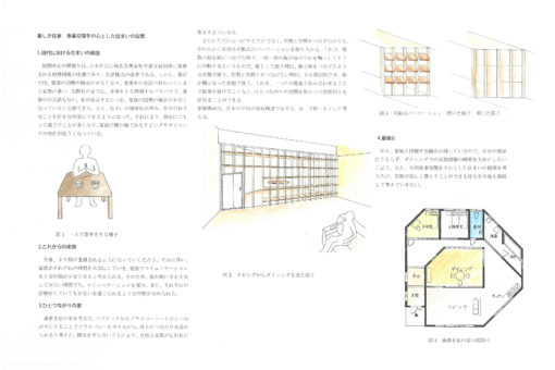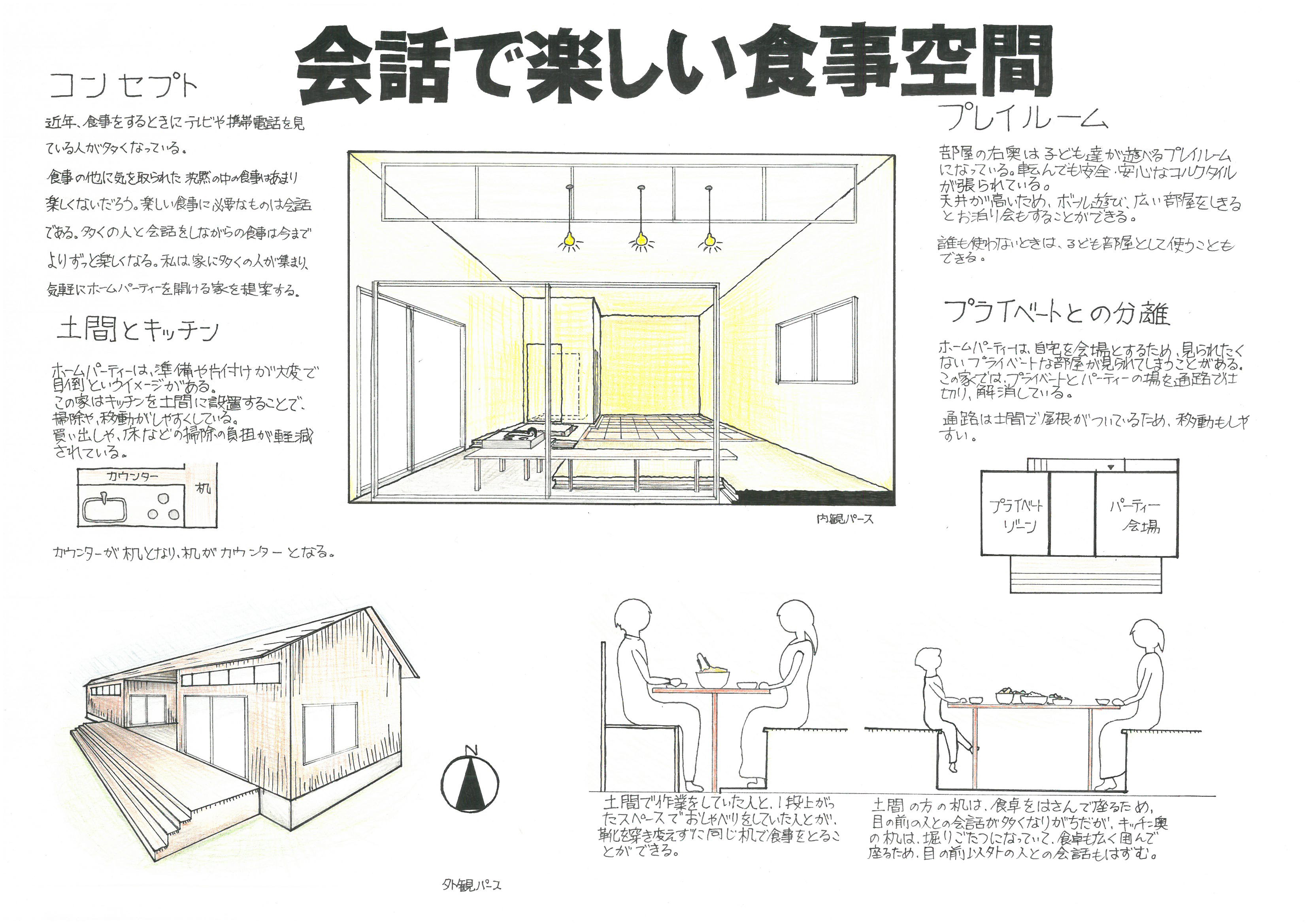 「佳作」に選定された「会話で楽しい食事空間」は、「会話」の大切さについて注目した作品です。会話はどのように生まれるかの検討を行い気軽にホームパーティーを開く提案が行われています。かつての台所にみられた「土間」を上手に活用し、後片付けなどに配慮されています。人を招きいれるさまざまな工夫がされ、プライベートとの区別も明確となっています